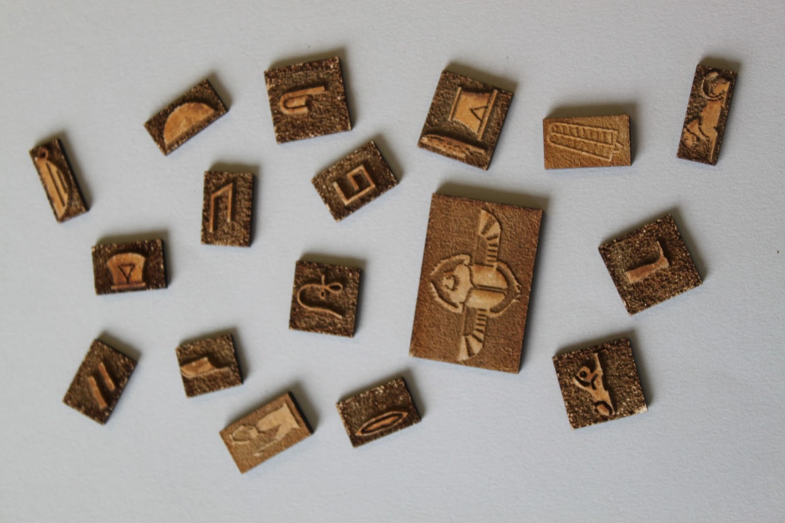 Making my Own Hieroglyphs, I started by vectoring out and creating some characters in Illustrator to work from. When working with the laser cutting I made the hieroglyph white and the surrounding area black, when using the laser cutting under the raster setting It removed 2mm of wood in the black areas out of 4mm plywood. Some of my experiments are below.